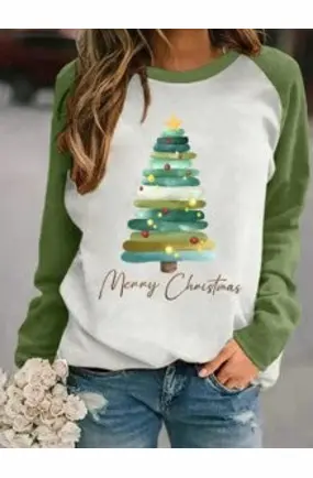 Women's Christmas Tree & Letter Printed Raglan Sleeve Crew Neck T-Shirt L
